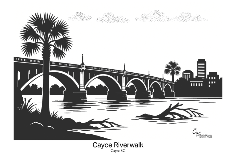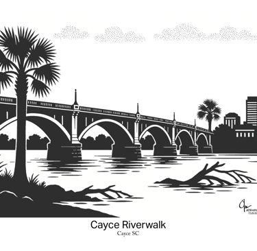 We’re working on a five-silhouette series right now. We’re calling this series Riverwalks and Waterfronts. It will include the Georgetown Harborwalk (above), Cayce Riverwalk (below), and waterfronts in Conway, Beaufort, and Little River (still in the works).